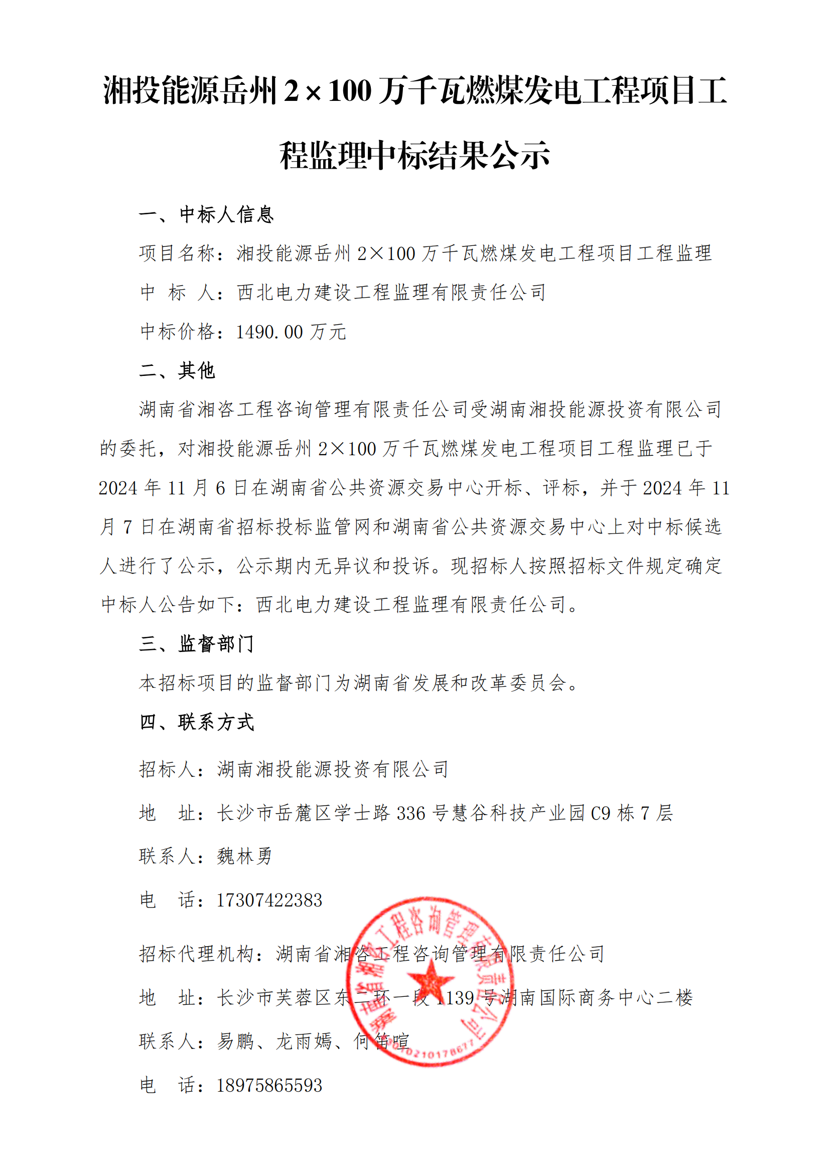湘投能源岳州2×100万千瓦燃煤发电工程项目工程监理中标结果公示(以政府部门指定媒体发布为准)